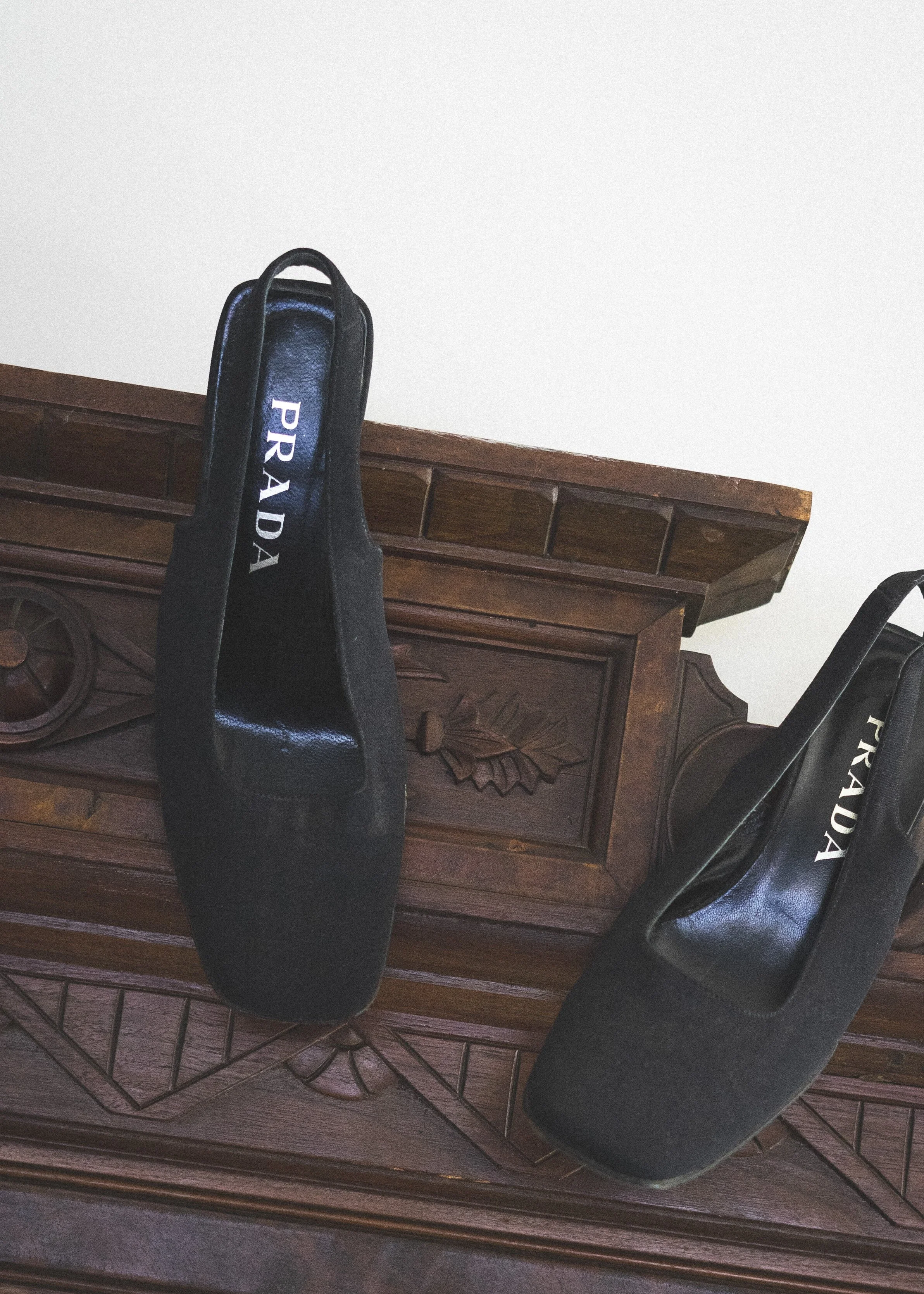these square-toe Prada slingback pumps are made in a black woven cotton fabric upper with wooden block heel and sole. the perfect spring sandal to go with everything. made in Italy. by Prada. size 37 1/2.